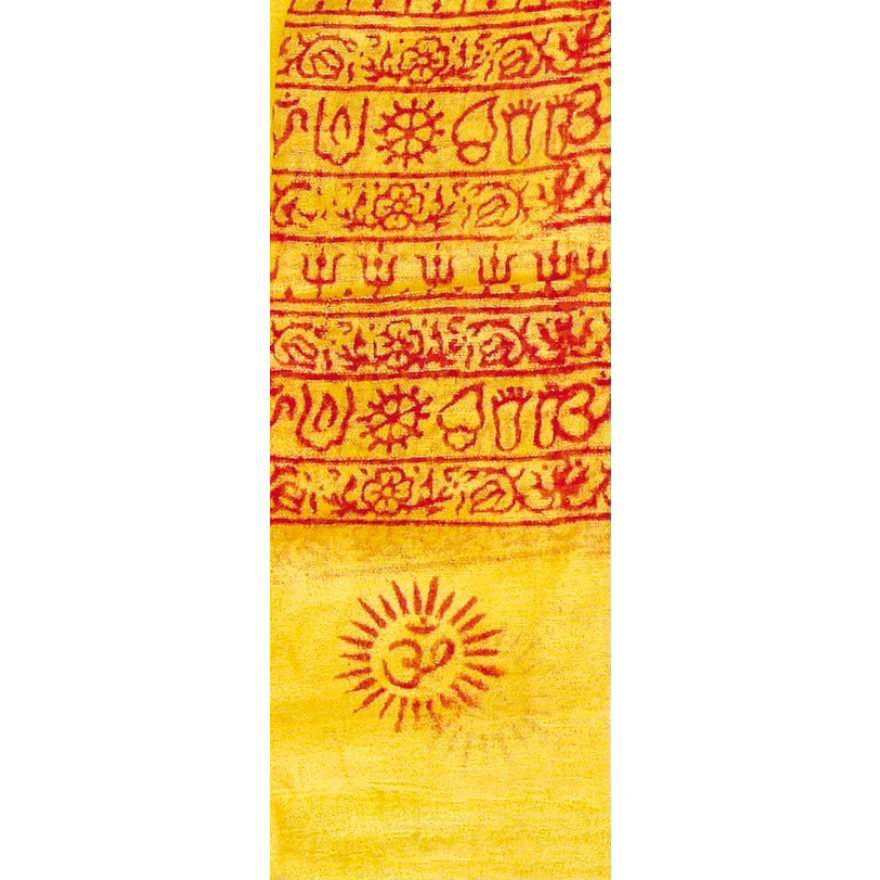 Der gelbe Gebetsschal aus Baumwolle ist rot bedruckt mit buddhistischen Versen, Symbolen und Mantras.