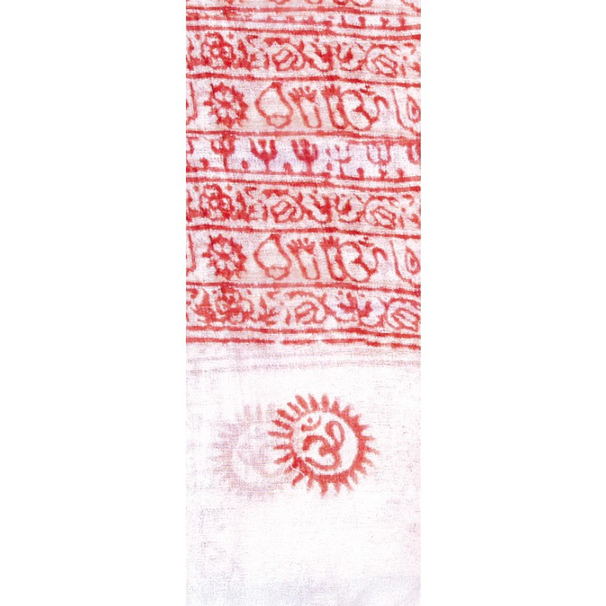 Der weisse Gebetsschal aus Baumwolle ist rot bedruckt mit buddhistischen Versen, Symbolen und Mantras.