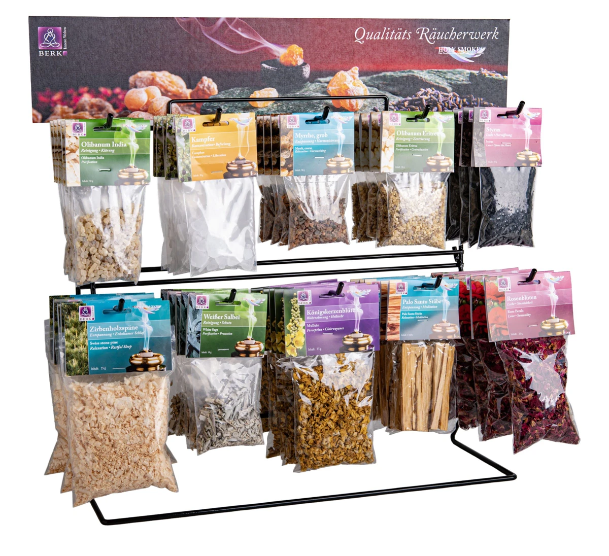Bestückt ist es mit je 5 Stk. von den bestlaufendsten Harzen, Blüten, Hölzer und Kräuter von Berk.