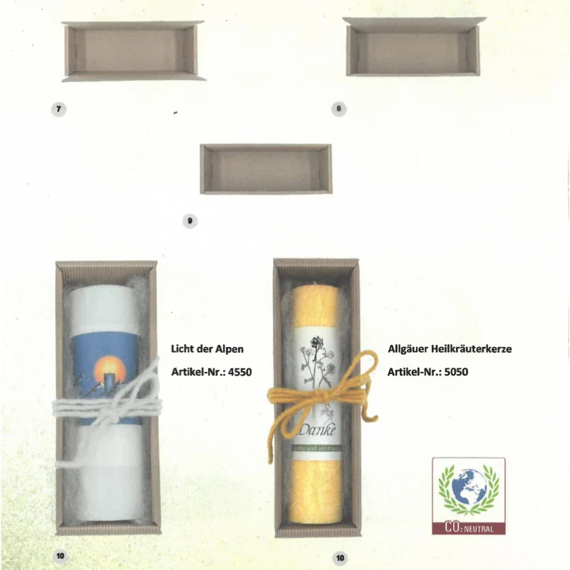 Die Geschenkbox für die Duftkerzen Licht der Alpen, VE-5 ist aus Wellkarton und hat die perfekte Grösse für Licht der Alpen Kerze. Die Geschenkkartons kommen als Verkaufseinheit von 5 Stück und müssen noch zusammengefaltet werden. Es liegt eine Faltanleitung bei.