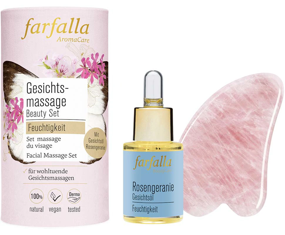 Inhalt: 1x Gesichtsöl Rosengeranie 15ml, 1x Gua Sha aus Rosenquarz. Dein entspannendes Ritual für Haut und Seele für einen straffen, strahlenden und gesunden Teint. Perfekt ergänzen sich die fernöstliche Tradition der Gua Sha-Massage und das hautpflegende, regenerierende Gesichtsöl mit dem ätherischen Öl von Rosengeranie. Die sanfte Massage mit dem hautschmeichelnden Rosenquarz aktiviert Durchblutung und Lymphsystem, entspannt die Gesichtsmuskeln, fördert die Aufnahme von Wirkstoffen und unterstützt die Hautregeneration.