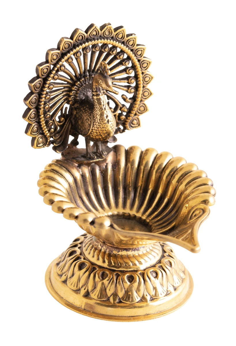 Auch wenn die Gheelampe schlicht erscheinen mag, so trägt diese Pfau-Gheelampe eine tiefe Symbolik, indem sie das Irdische mit dem Göttlichen vereint.