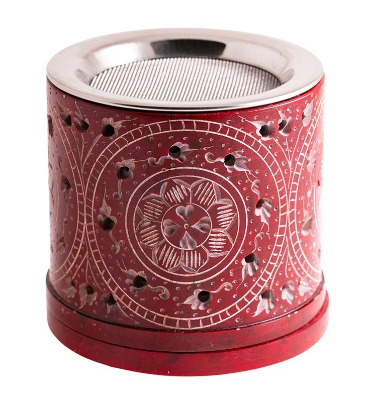 Siebgefäss aus Speckstein in alt orientalischer indischer Kunst hergestellt. Fein von Hand geschnitzt und graviert bringt es einen Hauch des Orients in jedes Ambiente. Kleine Filzkleber am Boden verhindern ein Zerkratzen des Mobilars.