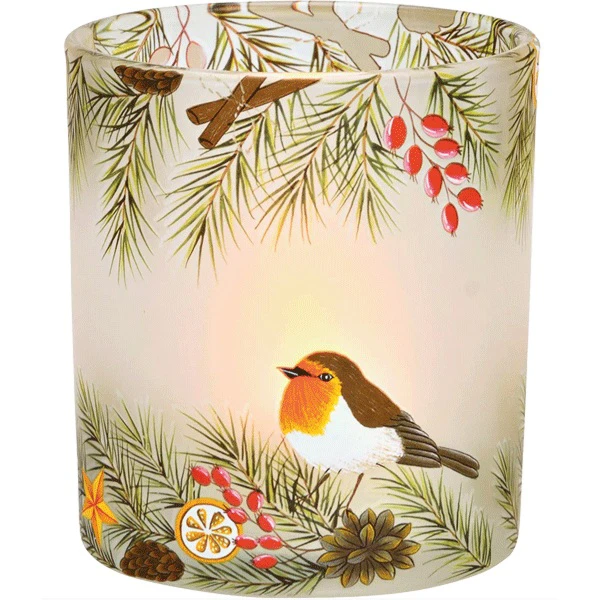 Ein feines Glas-Windlicht, das ein Rotkehlchen zwischen winterlichen Tannenzweigen zeigt, ein Symbol für Hoffnung und Wärme in der kalten Jahreszeit. Sobald ein Teelicht entzündet wird, erstrahlt es in sanftem Licht und sorgt für eine Atmosphäre der Geborgenheit und inneren Ruhe. Ein charmantes und liebevolles Accessoire für Ihre Winter- und Weihnachtsdekoration.