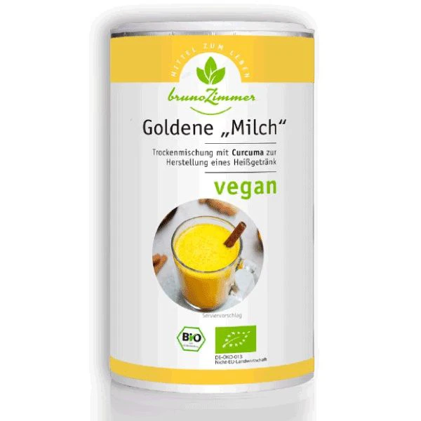 Die Rezeptur dieses wohlschmeckenden Pulvers 'Goldene Milch' von Bruno Zimmer lehnt sich an das aus dem Ayurveda bekannte Getränk an. Die wichtigsten Bestandteile der Mischung sind Kurkuma, Zimt, Ingwer und Pfeffer. 'Goldene Milch' schmeckt leicht würzig-scharf und kann durch die Zugabe von etwas Honig oder Kokosblütenzucker nach Belieben gesüsst werden und ist durch und durch vegan. Sie benötigen lediglich 1 Teelöffel (5 g) Pulver zur Herstellung von 200ml Heissgetränk.