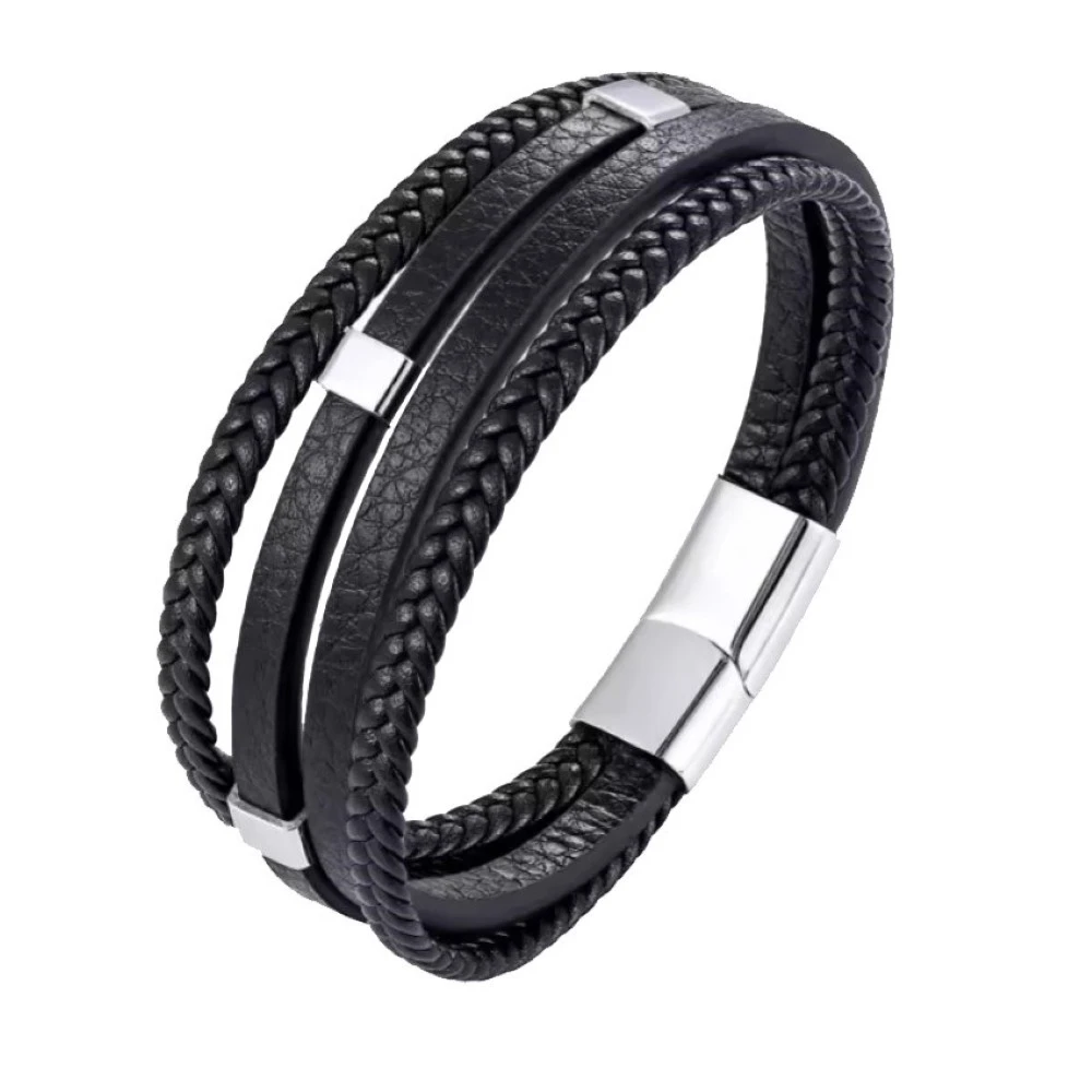Bracelet homme 4 brins, cuir avec boucles en acier inoxydable, noir, 21 x2 cm