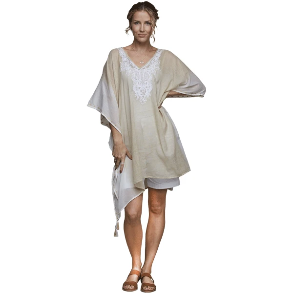 Mit seinem sanften Farbspiel und dem luftig-weiten Schnitt ist der Kaftan »Nova« ein echter Allrounder für warme Tage. Ob am Strand, zu Hause oder unterwegs – er umhüllt Sie mit natürlicher Eleganz und angenehmem Tragekomfort. Die Kombination aus zartem Weiss und warmem Beigeton verleiht dem Design eine ruhige, stilvolle Ausstrahlung und lässt sich mühelos kombinieren. Aus 100 % Baumwolle gefertigt, ist »Nova« hautfreundlich, atmungsaktiv und wunderbar leicht – perfekt für sonnige Stunden voller Leichtigkeit.