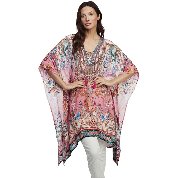 Der Kaftan »Lunaire« verführt mit seinem fließenden Schnitt, zarten Pinktönen und einem edlen Muster im Hauch des Orients. Aus reiner Viskose gefertigt, schmiegt er sich weich an die Haut und lässt Sie auch an warmen Tagen stilvoll und luftig gekleidet sein. Ein tiefer V-Ausschnitt mit feiner Perlenstickerei und Bindeband verleiht dem Kaftan eine feminine Note, während die seitlich verlängerte Silhouette sanft fliessend fällt und die Figur umspielt. Ob übereinem Shirt, zu Jeans oder als stilvoller Überwurf am Strand – »Lunaire« ist ein vielseitiger Begleiter für alle, die Leichtigkeit und Stil miteinander verbinden möchten. Ein Must-have für sonnige Tage mit einem Hauch Exotik.