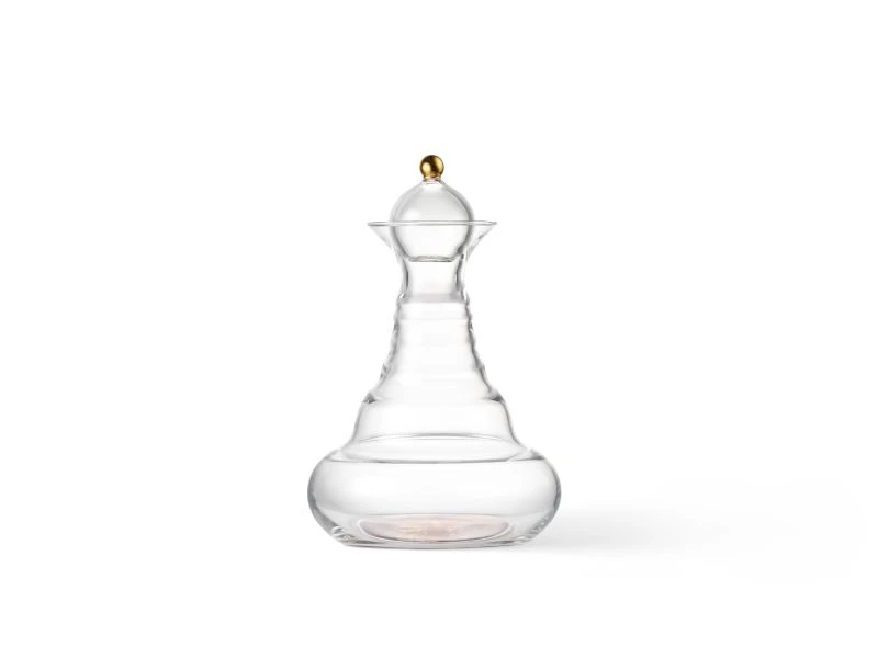 Der Glasdeckel mit edlem Goldknauf ergänzt die Karaffe um ein feines Detail, das sowohl funktional als auch ästhetisch überzeugt. Mundgeblasen nach alter Glasmacherkunst, wird jede Karaffe zu einem einzigartigen Unikat, das achtsamen Genuss und Stilbewusstsein im Alltag unterstreicht.