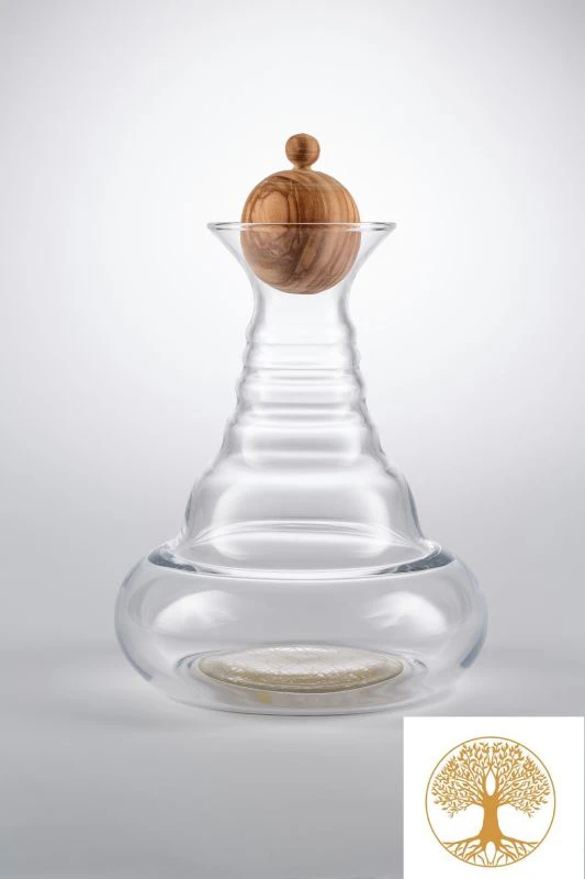 Der edle Olivenholzdeckel ergänzt die Karaffe durch seine warme Ausstrahlung und seine symbolische Bedeutung für Frieden, Fruchtbarkeit und Inspiration.