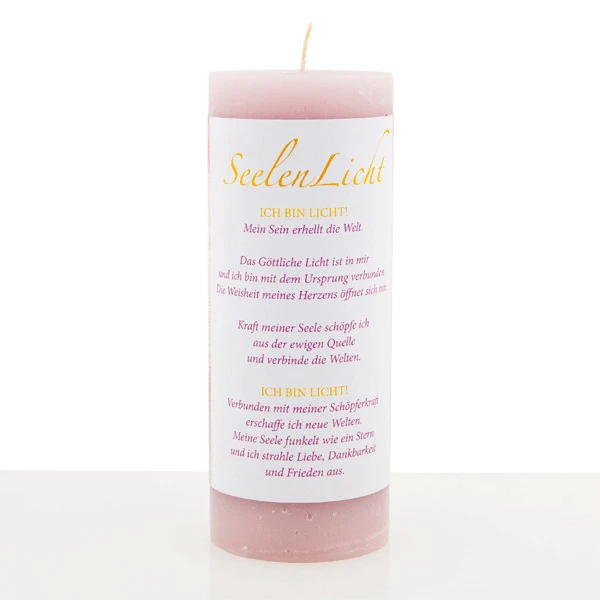 Die Gebetskerze Seelenlicht in softrosa mit dem schönen Gebet auf der Banderole verbindet Sie mit Ihrem inneren Licht.