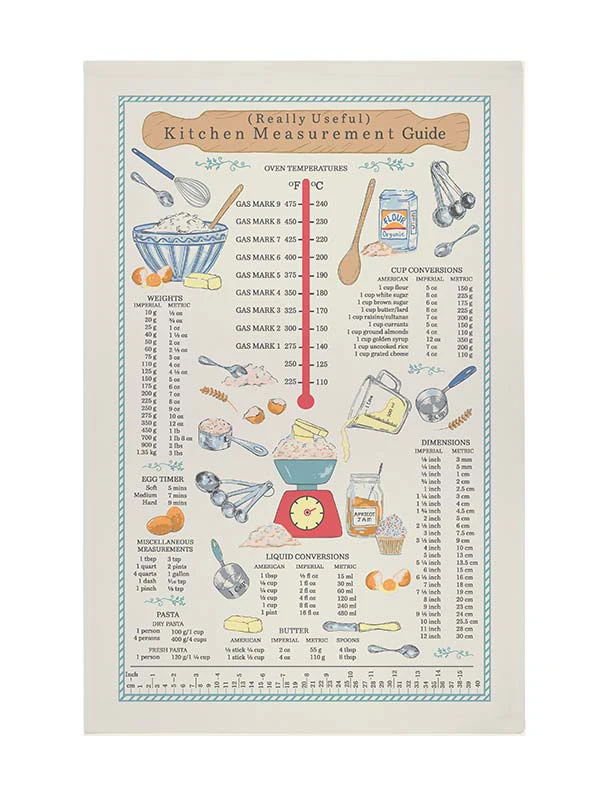 Dieses Geschirrtuch sieht nicht nur gut aus, sondern enthält auch viele praktische Informationen - imperiale und metrische Umrechnungen, amerikanische Cups, trockene und flüssige Zutaten... sowie Tipps für Nudelportionen und eine Anleitung für die Eieruhr! Die Aquarellzeichnungen erwecken das Design zum Leben und sorgen für eine moderne Landhausästhetik.
