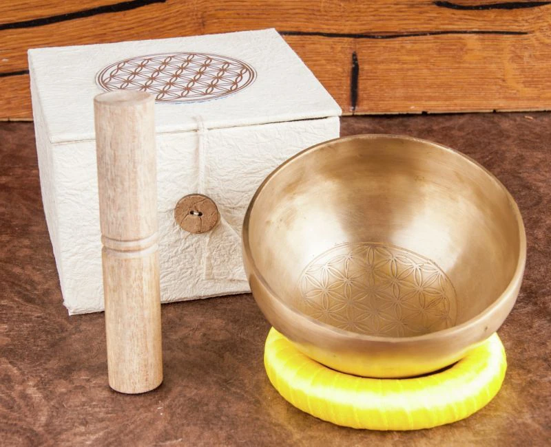 Handgehämmerte Klangschale mit einer Gravur der Blume des Lebens. Diese Klangschalen sehen wunderschön aus und haben auch eine grosse Schwingungswirkung. Die Kraft der Blume des Lebens, des Ursymbols für Manifestation, schwingt bei jeder Drehung der Klangschale mit und hilft uns tiefer in unsere eigene Mitte zu kommen, Blockaden zu lösen und neue Lebensenergie freizusetzen.