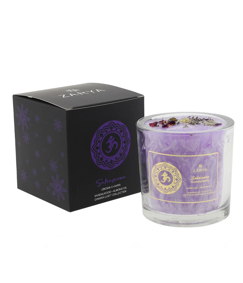Die Kronenchakra Duftkerze gibt es auch in der grösseren, 10 cm Variation.