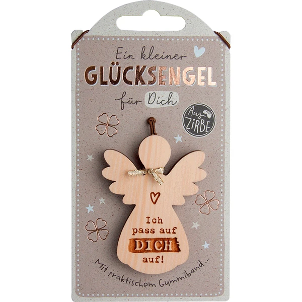 Dieser Glücksengel wird aus hochalpinem Zirbenholz gefertigt und mit einer feinen Gravur »Ich pass auf dich auf!« veredelt. Ein liebevolles Geschenk; ökologisch und so schön wie die Natur selbst. Mit praktischem Gummiband.