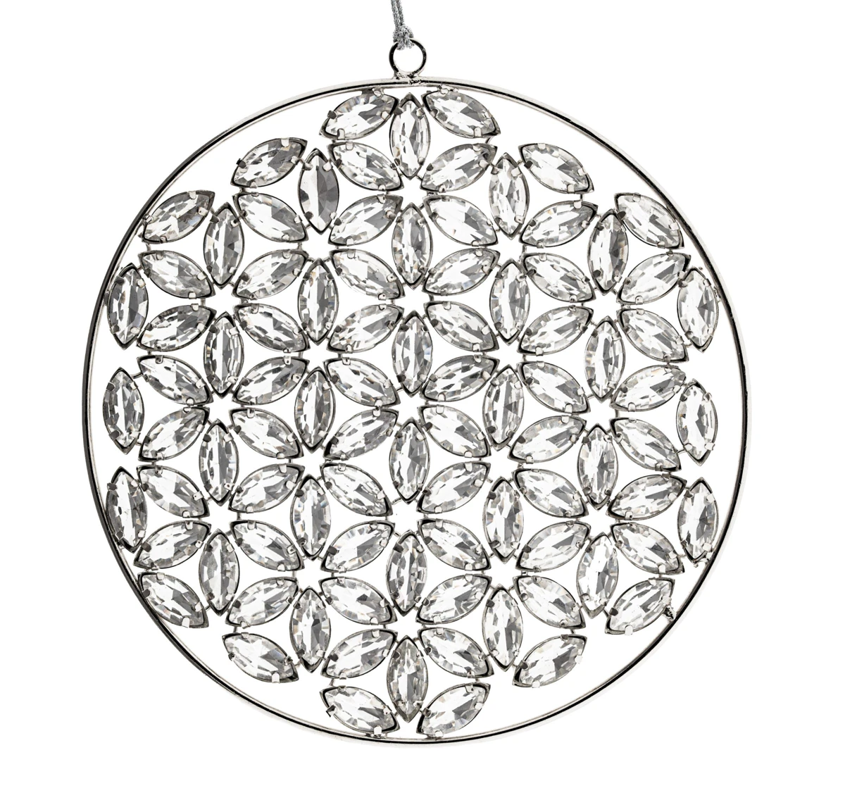 Bezaubernde, facettierte Glassteine, gefasst in silbernem Stahl, entfalten ihre ganze Strahlkraft und verzaubern den Raum.