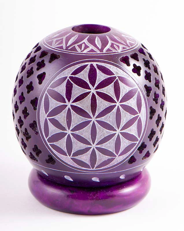 Das Kugelteelicht Blume des Lebens in lila aus Speckstein ist ein bezaubernder Raumharmonisierer. Zwischen den Energiesymbolen sind viele kleine Maharadscha Löcher, durch die das magische Licht energievoll die Umgebung erhellt. Die Teelichtkugel besteht aus einer Kugel aus Speckstein und einem Tellerchen als Untersetzer für das Teelicht.