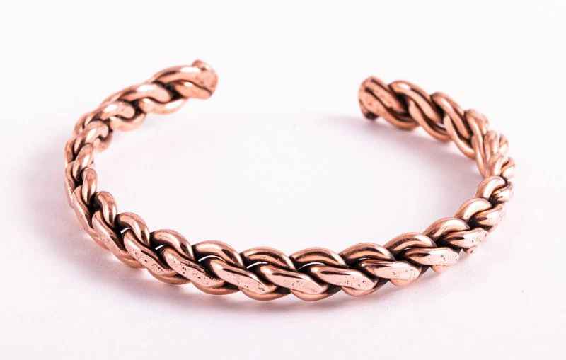 Dieser geflochtene Kupferarmreif passt an jedes Handgelenk, da das Armband offen und biegsam ist. Aus Kupfer wurde ein 9 mm dickes Band geflochten.