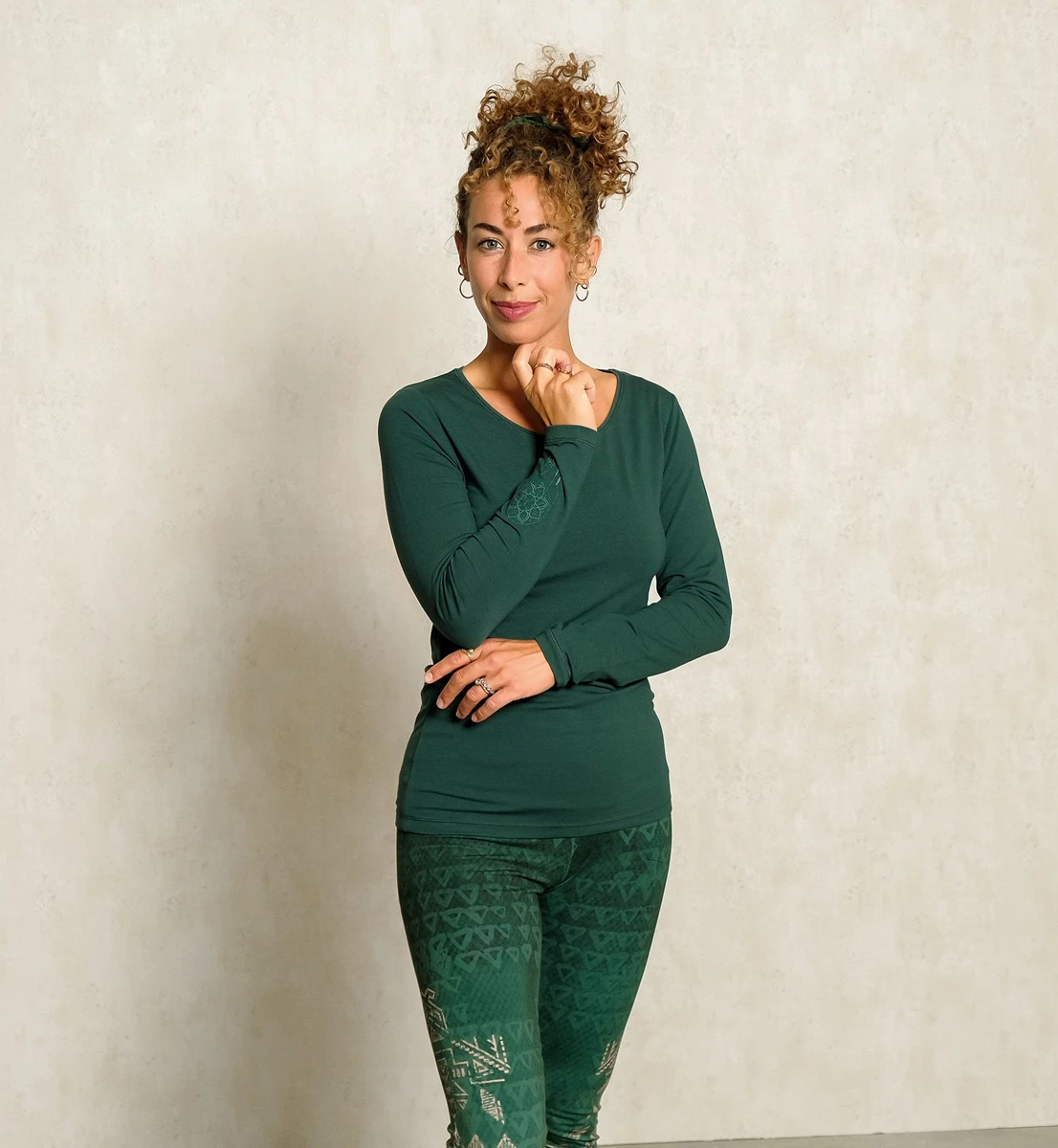 Das Langarm Shirt Chakra Flower in smaragd von The Spirit of OM ist elegant, zeitlos und unglaublich bequem. Der kuschelig samtige Griff des Bambus-Stoffes sorgt für ein unbeschreiblich angenehmes Tragegefühl. Die weiche Viskose-Faser aus Bambus gemixt mit Bio-Baumwolle ist bestens für Allergiker und sensible Haut geeignet. Dieses Shirt aus der Bambus-Kollektion eignet sich auch ideal für sportliche Aktivitäten z. B. Power-Yoga und Trekking, ist aber auch für den Alltag wunderbar geeignet. Die eingedruckten positiven Affirmationen im inneren Rückenteil und die Verzierung am Ärmel geben diesem Modell von The Spirit of OM seinen ganz besonderen Spirit.