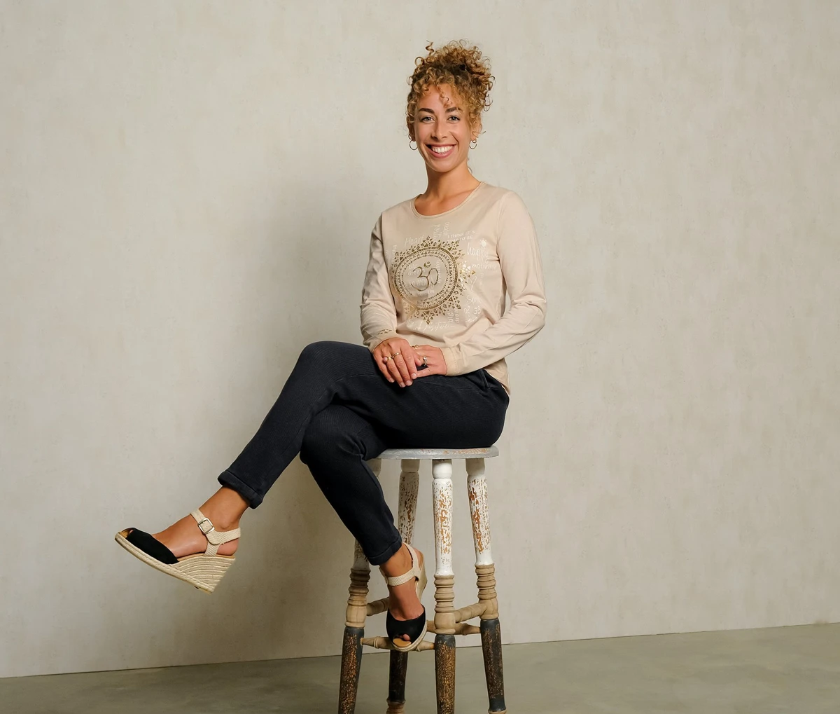 Das Langarm Shirt OM Mandala in sand von The Spirit of OM aus Bio-Baumwolle trägt sich wie eine zweite Haut. Die Farbe Gold bringt die Kraft der Sonne, sie ist königlich, warm, beständig und wertvoll. Sie steht für Reichtum im materiellen und spirituellen Sinne. Zusammen mit dem wundervollen OM-Mandala und den positiven Affirmationen kann dieses Shirt seiner Trägerin inneren Reichtum für die Seele bringen. In das Material wurde mikrofeiner Rosenquarz eingebracht, der das Herz und die Qualitäten der Liebe anspricht. Im Innendruck versteckt ist zusätzlich ein kleines Mandala mit der Blume des Lebens.