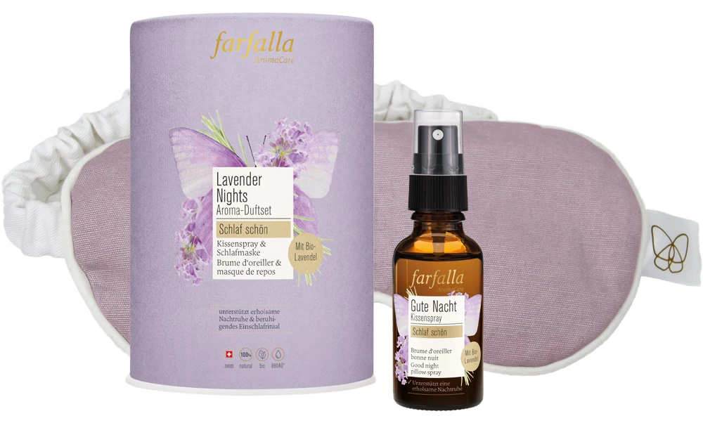 Inhalt: Schlafmaske aus rezyklierter Baumwolle gefüllt mit Lavendelblüten. Gute Nacht Kissenspray 30ml. Ein Rundum-Sorglos-Set für die erholsame Nachtruhe. Der sanft-blumige Kissenspray mit feinem Lavendel verwandelt dein Kissen in Wolke Sieben. Die Schlafmaske mit Lavendelfüllung komplettiert das Einschlafritual und begleitet dich mit ihrem Duft durch die Nacht.