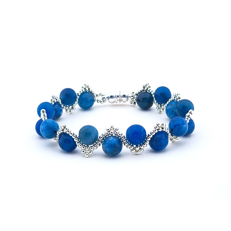 Dieses handgefertigte Edelstein-Armband, inspiriert vom tiefgehenden Wissen der Hildegard von Bingen, vereint die vitalisierenden Eigenschaften des Apatits mit der filigranen Eleganz der silbernen Miyuki Rocailles Perlen. Es dient zur energetischen Unterstützung der Lunge und fördert die Lebensenergie, die zwischenmenschliche Kommunikation sowie die seelische Zuwendung.