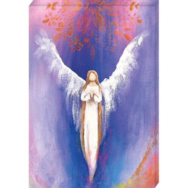 Dieser Engel breitet seine Flügel weit aus und legt anmutig die Hände vor sein Herz. Mit seinen sanften Blau-, Lila- und Rosatönen erinnert er Sie daran, dass Sie immer geborgen sind – egal, was im Außen geschieht. Das tiefe Blau stärkt Ihr Vertrauen, während das halbkreisförmige Mandala in warmem Orange Ihnen die Kraft schenkt, sich selbst als sicheren Hafen zu erfahren.