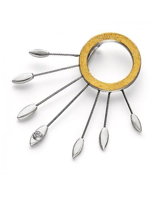 Durchmesser Kreis 12 mm, mit längstem Strahl 45 mm; Material: 925er Silber, 900er Gold, Stahl, Zirkonia.
