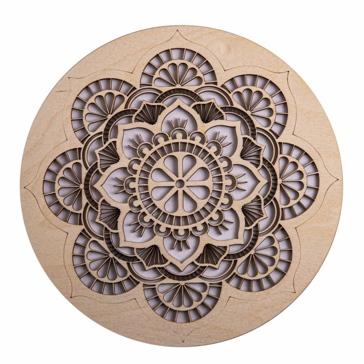 Das Mandala der inneren Entspannung aus Holz hat einen Durchmesser von 20 cm. Es wurde aus Birkensperrholz gelasert. Mandalas kommunizieren in magischer Weise mit dem Unterbewusstsein. Das meditative Betrachten kann tiefe seelische Entwicklungsprozesse auslösen, in dem man zum eigenen Ursprung zurückgeführt wird.