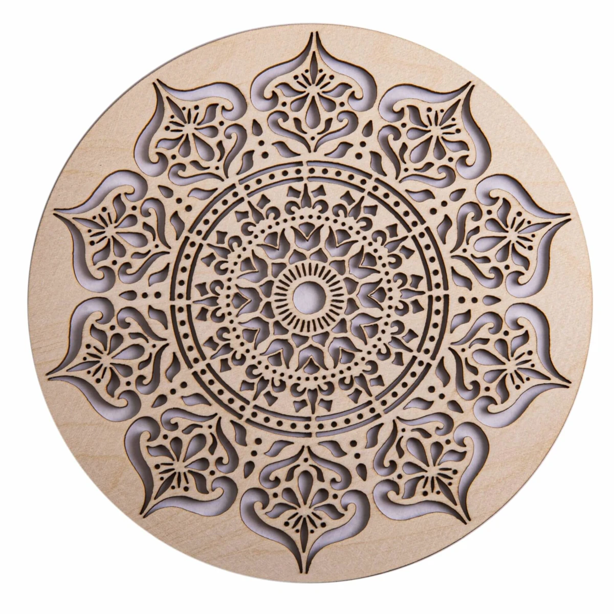 Das Mandala der inneren Weisheit aus Holz hat einen Durchmesser von 20 cm. Es wurde aus Birkensperrholz gelasert. Mandalas kommunizieren in magischer Weise mit dem Unterbewusstsein. Das meditative Betrachten kann tiefe seelische Entwicklungsprozesse auslösen, in dem man zum eigenen Ursprung zurückgeführt wird.