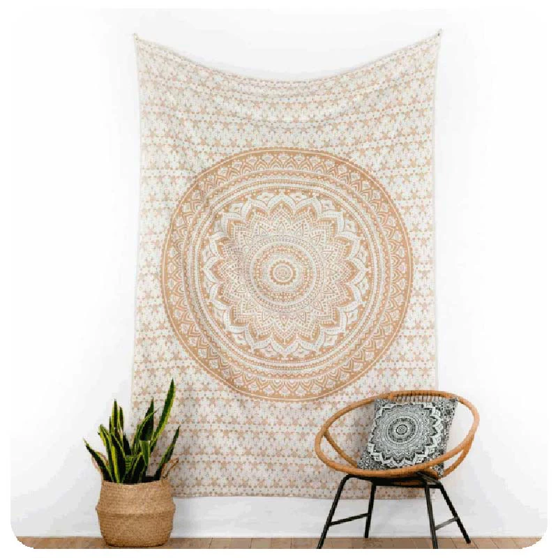Ein strahlendes Mandala in der Farbe Ombre-Ocker auf weissem Grund breitet sich auf diesem herrlichen Wandtuch aus. Die Farbe Ocker ist eine warme, tröstliche Farbe, die ein Gefühl von Sicherheit und Geborgenheit vermittelt. In einem Raum kann Ocker Wärme und Behaglichkeit schaffen und das Gefühl geben, ein Zuhause zu haben. Von einem Mandala geht eine enorme Stärke aus, die Sie positiv nutzen können. Ein Mandala kann dabei helfen, Stress zu reduzieren und ungewünschte Gedanken loszuwerden. Mandalas werden deshalb gerne als Meditationshilfe genutzt. Probieren Sie es doch einfach mal aus!
