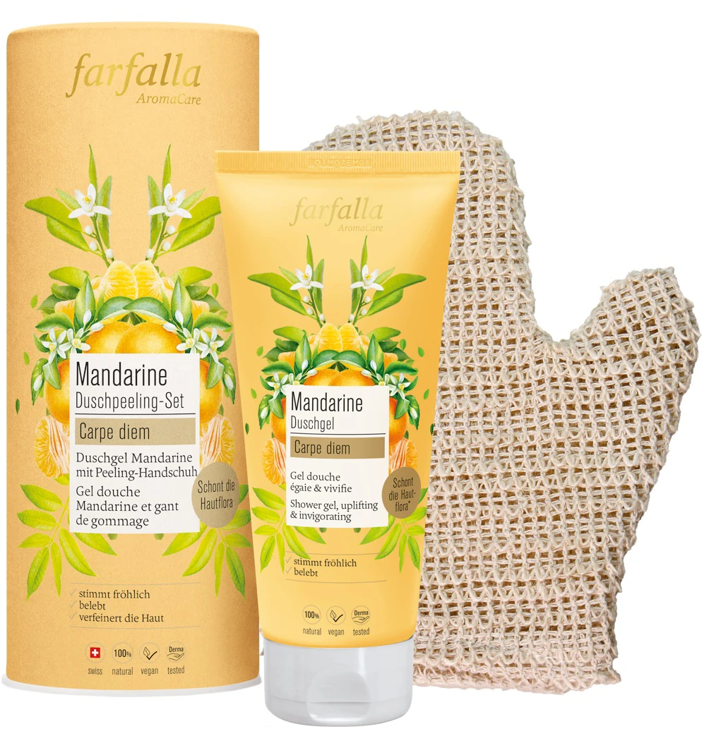 Inhalt: Duschgel Mandarine 200ml, Peelinghandschuh aus 100% Naturfasern (nur Handwäsche). Ein feuchtigkeitsspendendes Duscherlebnis, das die Sinne beflügelt. Das spritzige ätherische Öl der Mandarine vitalisiert und hilft dabei, das Potenzial jeden neuen Tages auszuschöpfen. Milde pflanzliche Tenside reinigen die Haut ohne Feuchtigkeitsverlust. Der sanfte Peelinghandschuh aus Baumwolle und Jute befreit deine Haut bei der sanften Körpermassage unter der Dusche von losen Hautschüppchen und sorgt für ein weiches, ebenmässiges Hautgefühl.
