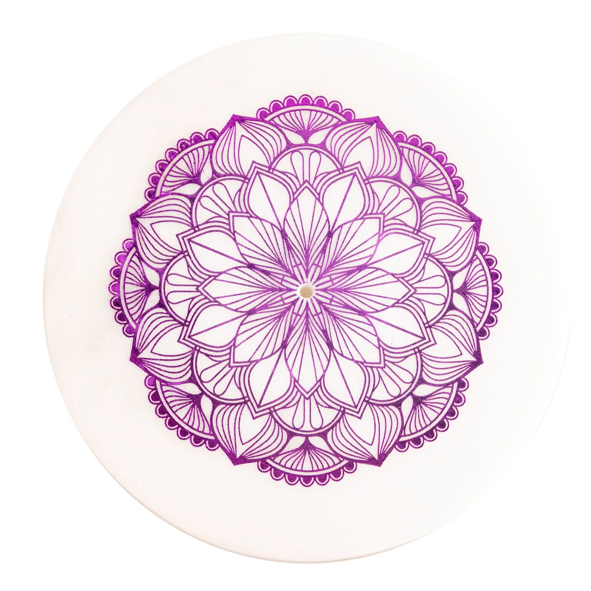 Als krönender Abschluss ist der Marmorhalter mit einem Aufdruck eines Lotusmandalas geschmückt. Das Mandala entwickelt seine Magie dank seiner immer wiederkehrenden Formen rund um den Kern. Das Betrachten kann tiefe seelische Prozesse auslösen, da man in meditativer, heilender Weise zum eigenen Ursprung zurückgeführt wird.