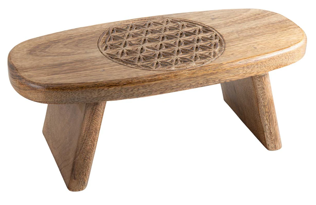 Stabiler Meditationshocker mit 3 cm dicken Holzplatten aus Mangoholz. Auf der Sitzfläche ist zur Unterstützung der Meditation eine 16 cm große Blume des Lebens eingraviert.