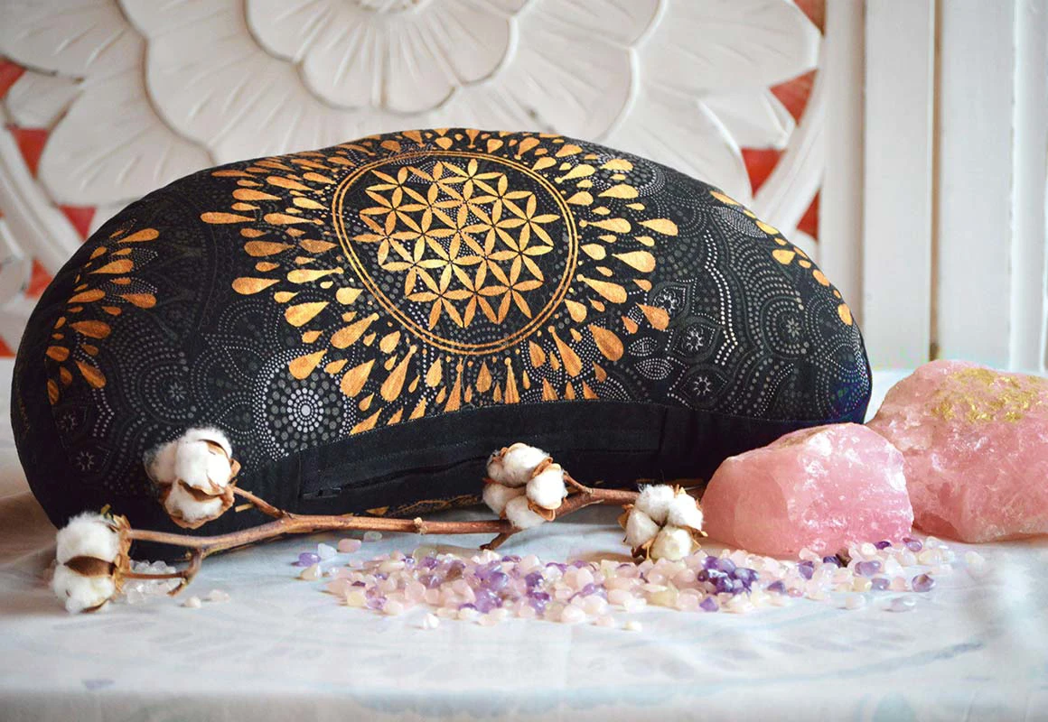 Das Halbmond Meditationskissen in schwarz/gold mit der Blume des Lebens von The Spirit of OM ist mit Bio-Dinkelspelz gefüllt. Als Besonderheit sind Rosenquarz- und Amethyst-Edelsteine fühlbar im Trageband eingenäht und pulverisierter Rosenquarz wurde im Druckmotiv verarbeitet.