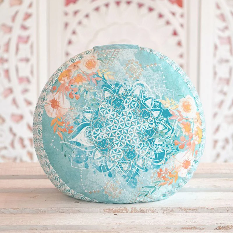 Dieses Meditaionskissen kann beliebig gewendet werden. Auf der einen Seite finden Sie das florale Mandala und auf der anderen Seite die Blume des Lebens. Das Motiv der Blume des Lebens unterstützt Ihre innere Harmonie und fördert Ihr inneres Wohlbefinden - perfekt für jede Meditation. Um die Blume des Lebens herum steht die positive und stärkende Affirmation "health, love, peace, freedom & harmony" und "creative, lively, unique".