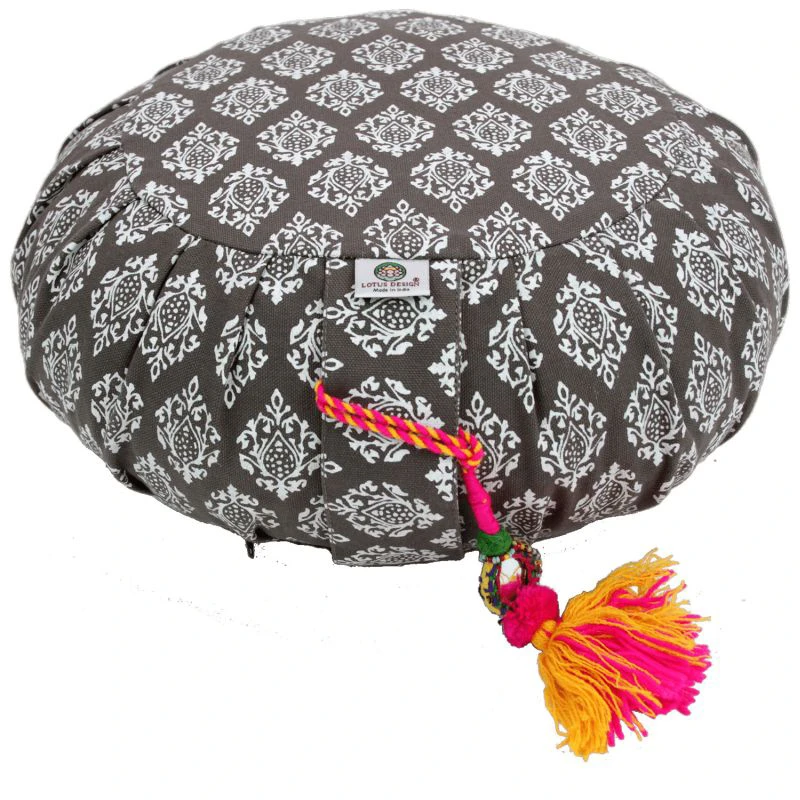 Die Stoffe für diesen Zafu kommen aus Indien und haben Muster und Designs, die in der Holzblock-Drucktechnik hergestellt werden. Traditionell werden diese jahrhundertealten Handwerkstechniken von einer Generation zur nächsten weiter gegeben. Jede Farbe und jedes Muster hat seine eigene Bedeutung und früher wurden diese Muster auch für die Dekoration von Räumen verwendet. In Form und Farbe ist dieses Meditationskissen beige-grau den sehr traditionellen Meditationskissen nachempfunden, die auch heute noch in Indien verwendet werden. In dieser Grösse ist der Zafu sehr angenehm zu handhaben und die Füllung aus Buchweizenschalen macht ihn zu einem Leichtgewicht. Ein Charakteristikum an dieser Art Meditationskissen sind die Dehnfalten, die dem Zafu seine besondere flachovale Form geben. Das Inlett hat die gleiche Form wie der Bezug. Im Sitzen gibt der Bezug etwas nach, er kann sich dehnen und dadurch wird der Zafu angenehm weich, variabel und bequem.