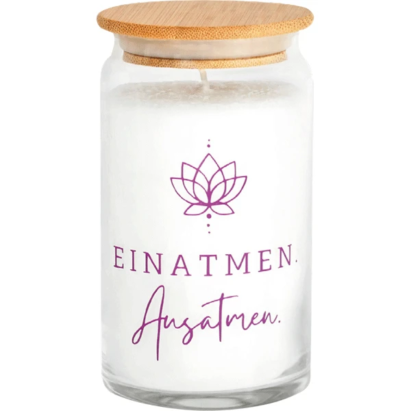 Ein zartes Lotosmotiv und der Schriftzug »Einatmen – Ausatmen« erinnern daran, zur Ruhe zu kommen. Die edle Kerze im Glas mit Holzdeckel verbreitet eine sanfte Lavendelnote und schafft eine entspannte Atmosphäre – ideal zum Verschenken oder für Ihre persönliche Auszeit.
