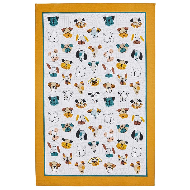 A beautiful Tea Towel created by the northern Irish company Ulster Weavers, with a quirky, fun dog design inspired by smudging different size paint brushes and then adding dog faces.
