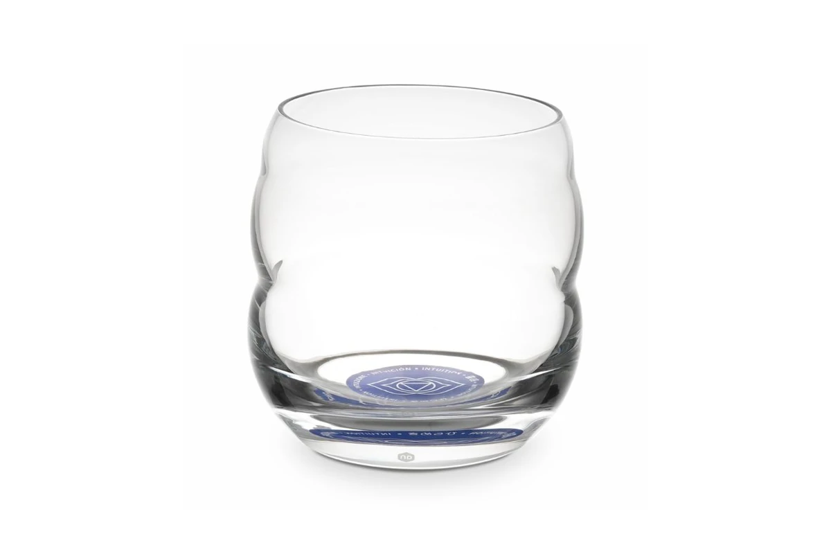 Dieses Mythos Chakra Glas trägt das dunkelviolette Augenbrauen-Chakra Motiv mit der Affirmation Intuition.