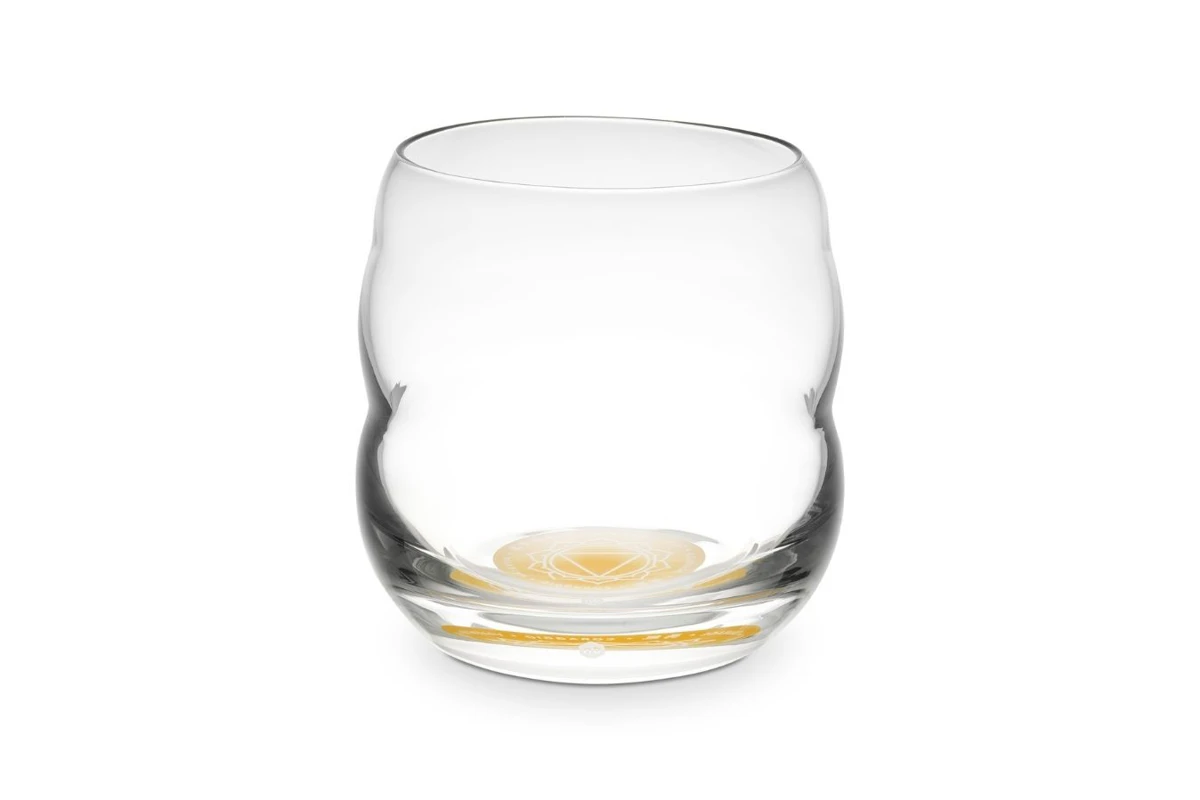 Dieses Mythos Chakra Glas trägt das gelbe Solarplexus-Chakra Motiv mit der Affirmation Mut.