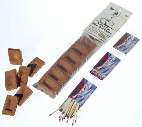 Handgepresste „Natur-Kräuter-Holzkohle"- zum Räuchern von losem Räucherwerk wie Harzen, Hölzern und Kräutern. „Natur Pur"- ist ideal für alle Rituale. Die Kräuterkohle glimmt langsam durch und verglimmt Stück für Stück das auf ihm liegende Harz.
