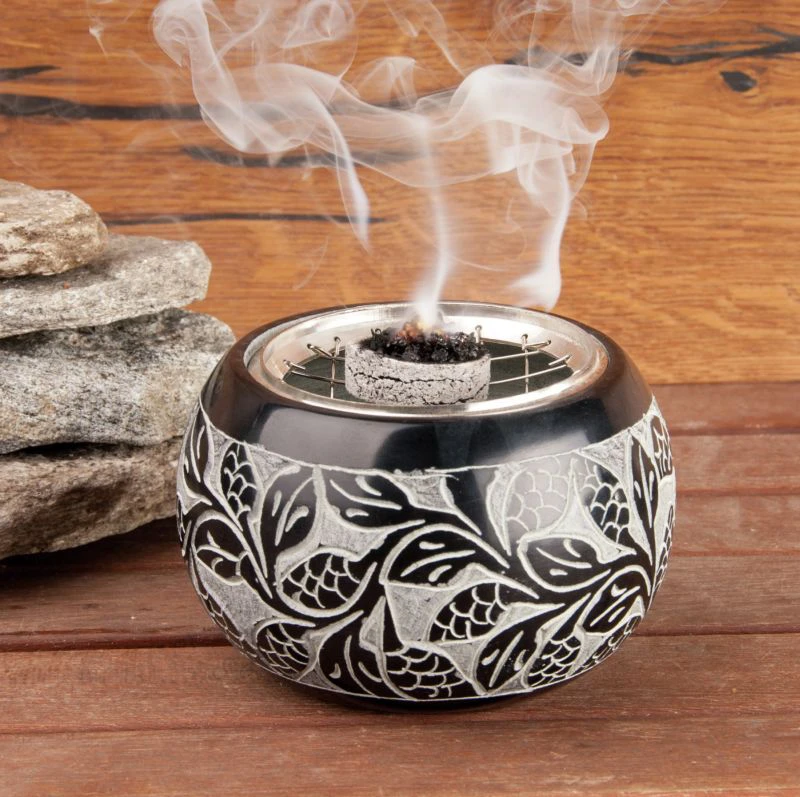 Edles, schweres Netzgefäss aus Speckstein. Dieses Gefäss wird auch mit glühender Kohle nicht heiss. Man kann es ohne Unterlage auf jeden Tisch stellen und gefahrlos räuchern. Die Kohle wird einfach auf das grossmaschige Netz gelegt und angezündet.