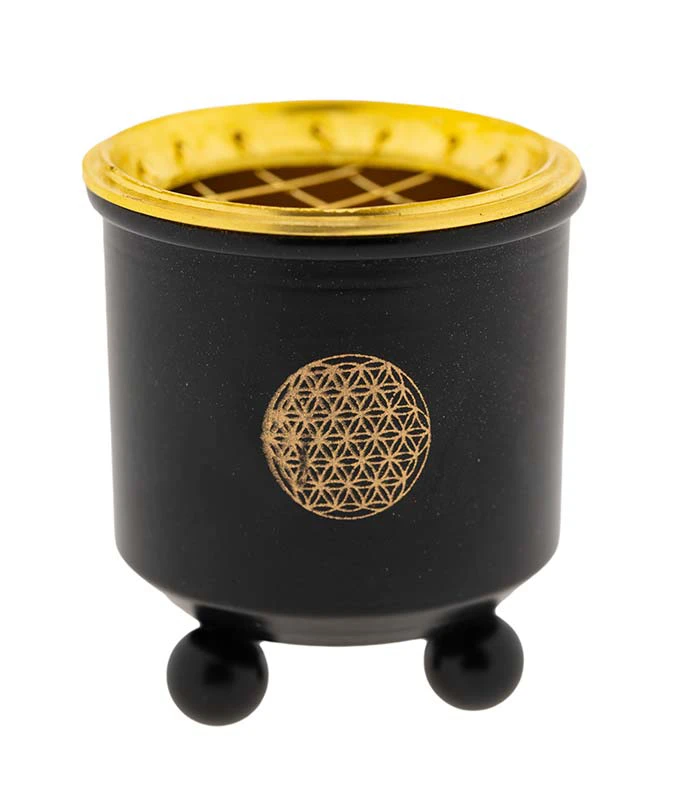 Stilvolle Räucherschale aus pulverbeschichtetem Eisen mit Messingnetz. Eine goldene Lebensblume unterstützt das energetische Räuchern und sorgt für eine edle Optik.