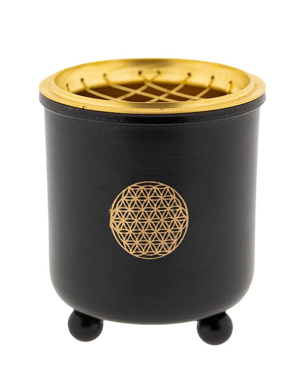 Stilvolle Räucherschale aus pulverbeschichtetem Eisen mit Messingnetz. Eine goldene Lebensblume unterstützt das energetische Räuchern und sorgt für eine edle Optik.