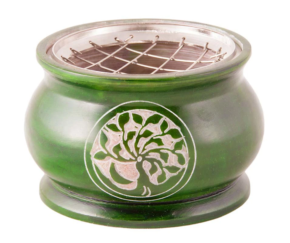 Edles, schweres Netzgefäss aus Speckstein. Dieses Gefäss wird auch mit glühender Kohle nicht heiss. Man kann es ohne Unterlage auf jeden Tisch stellen und gefahrlos räuchern. Die Kohle wird einfach auf das grossmaschige Netz gelegt und angezündet.