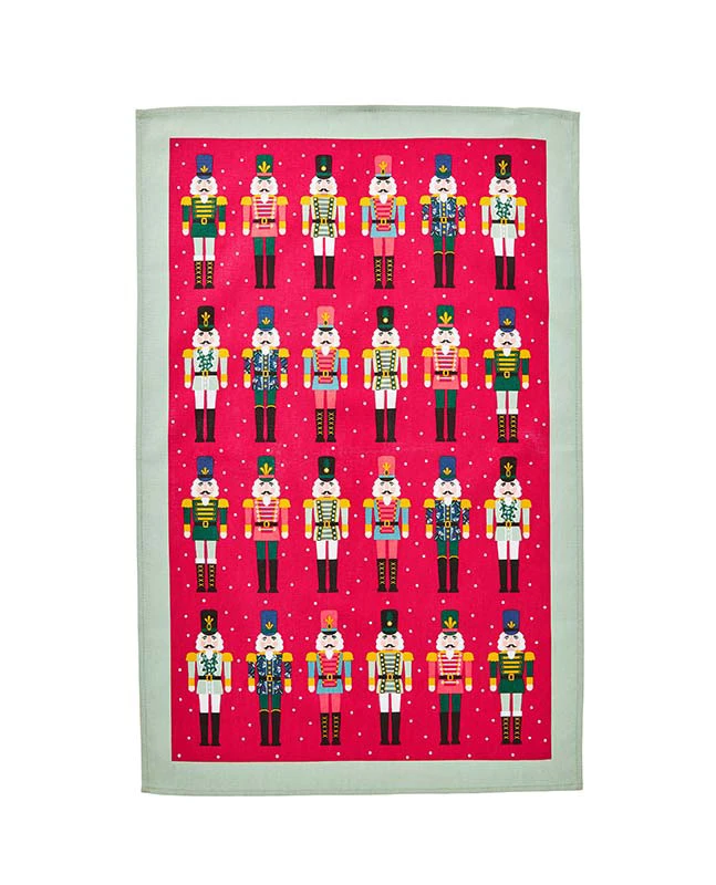 A Christmassy Cotton Tea Towel created by the northern Irish company Ulster Weavers. Originating in Germany in the late 17th century, handcrafted nutcracker dolls were originally given as gifts over the festive period. This parade of immaculately dressed soldiers show off brightly coloured uniforms and complimenting plumed hats.