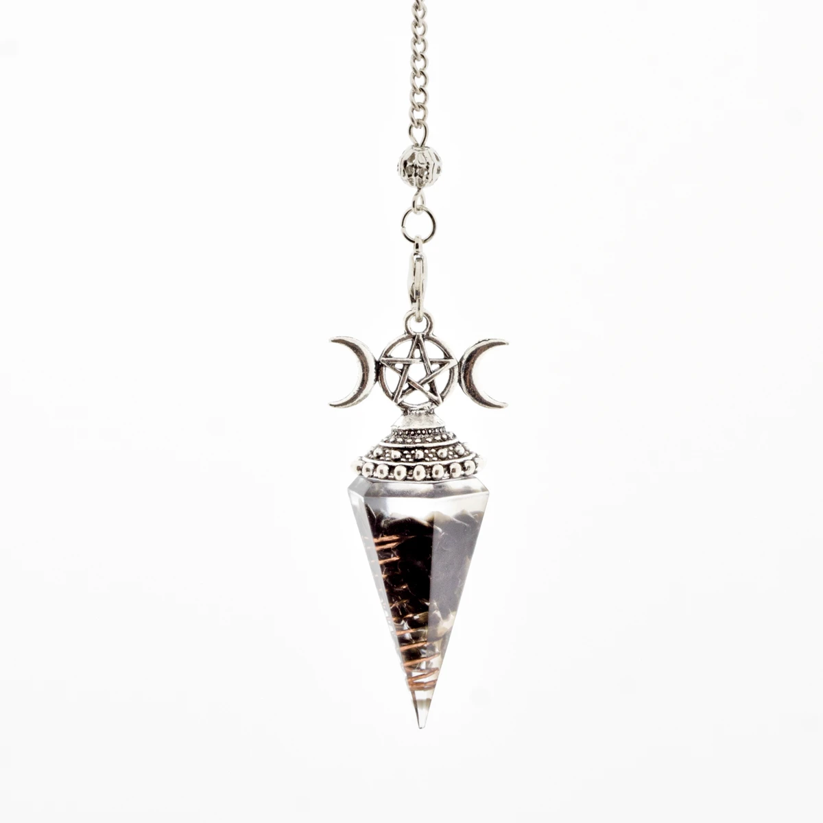 Das Pendel mit dem Symbol der Dreifachen Göttin verbindet die Kraft der Mondphasen mit der Energie von Obsidian, der im Orgonit eingebettet ist. Diese Pendel vereinen die mystische Weisheit des Mondes mit den schützenden und heilenden Eigenschaften der Edelsteine.