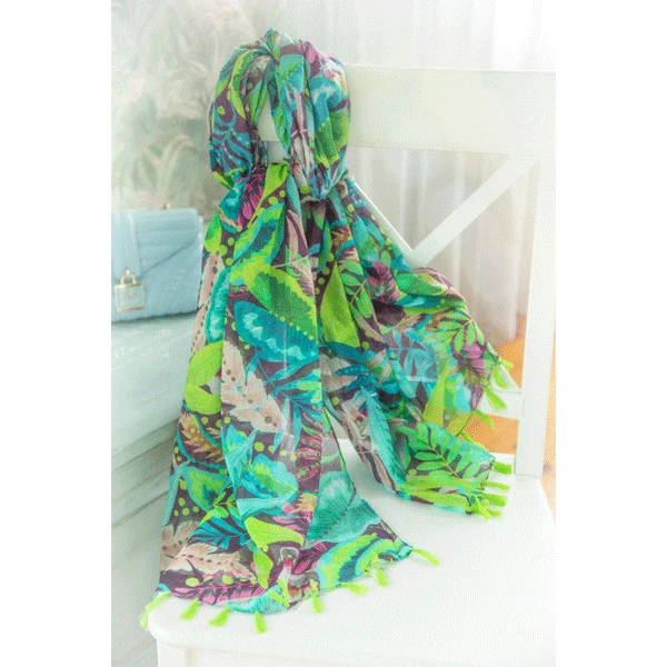 Wie ein tropischer Garten in Bewegung entfaltet sich der »Dschungel Zauber« auf weicher Baumwolle. Grüne und türkise Farbwelten leuchten kraftvoll auf einem erdigen Grund – lebendig, geheimnisvoll und voller natürlicher Energie. Die federleichte Qualität schmiegt sich sanft an die Haut, feine Tasseln tanzen am Saum und verleihen dem Design eine verspielte Note. Ob als luftiger Schal, Pareo oder stilvoller Reisebegleiter.