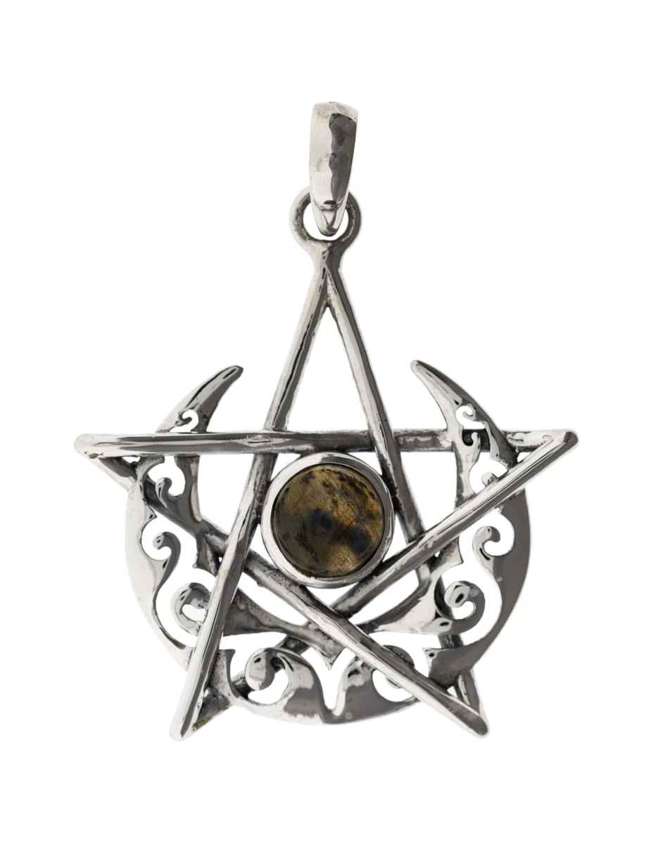 Das Pentagramm ist ein kraftvolles Schutzzeichen, unterstützt durch den grossen Labradorit, der als Schutzstein gilt. Der Mond steht für Wandlungsfähigkeit und Intuition. Unter dem Schutz des Pentagramms kann geistiges Wachstum, Veränderung und Wandlung geschehen. Dieses Zeichen trägt uns sicher durch alle Herausforderungen und Veränderungen.